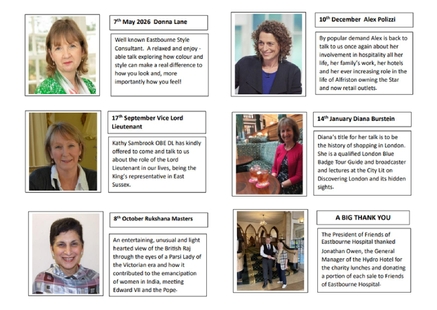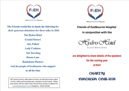 The Friends of Eastbourne Hospital are delighted to share the details of the Hydro Hotel’s Charity Luncheon Club speakers for 2026. Donations from ticket sales of these luncheons are very generously given by the Hydro Hotel to the Friends, and therefore bookings must be made directly with the Hydro Hotel.